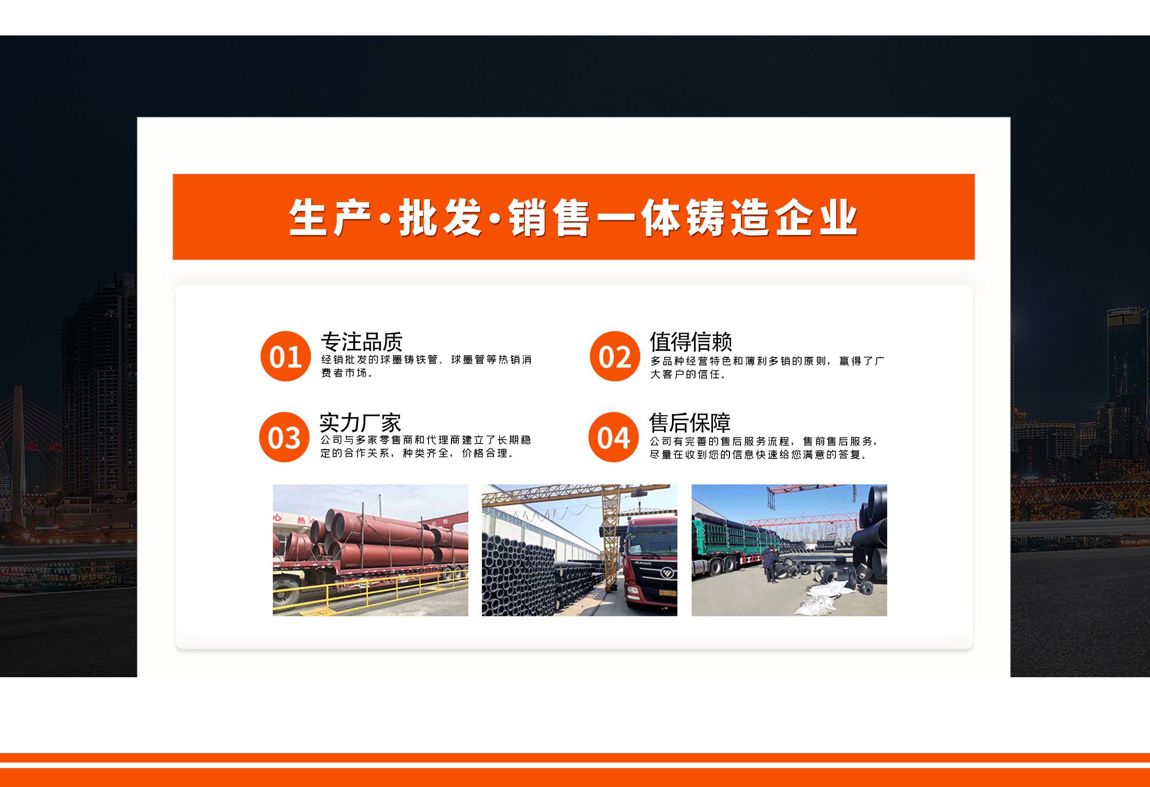青島金源達管業(yè)有限公司主要經(jīng)營各種規(guī)格球墨鑄鐵管,球墨管,球墨鑄鐵管廠家等產(chǎn)品,質(zhì)量可靠,誠信經(jīng)營,值得信賴! 青島金源達管業(yè)有限公司始終堅持“誠信立業(yè),追求卓越,合作共贏,共同發(fā)展”,竭誠歡迎各界朋友來廠參觀指導,洽談業(yè)務(wù)。我們愿與您攜手共進,互惠雙贏,共創(chuàng)未來! 公司堅持“以奮斗者為本”的理念,關(guān)心關(guān)愛職工,職工的獲得感、幸福感更加充實、更有保障、更可持續(xù);秉承“忠誠企業(yè)、勇于擔當、開拓創(chuàng)新、主動作為”,堅持黨建領(lǐng)航、創(chuàng)新驅(qū)動、文化塑魂、奉獻社會,全面致力于綠色、低碳、高效、高質(zhì)量發(fā)展。 愿與各界朋友攜手并進,共創(chuàng)未來!...